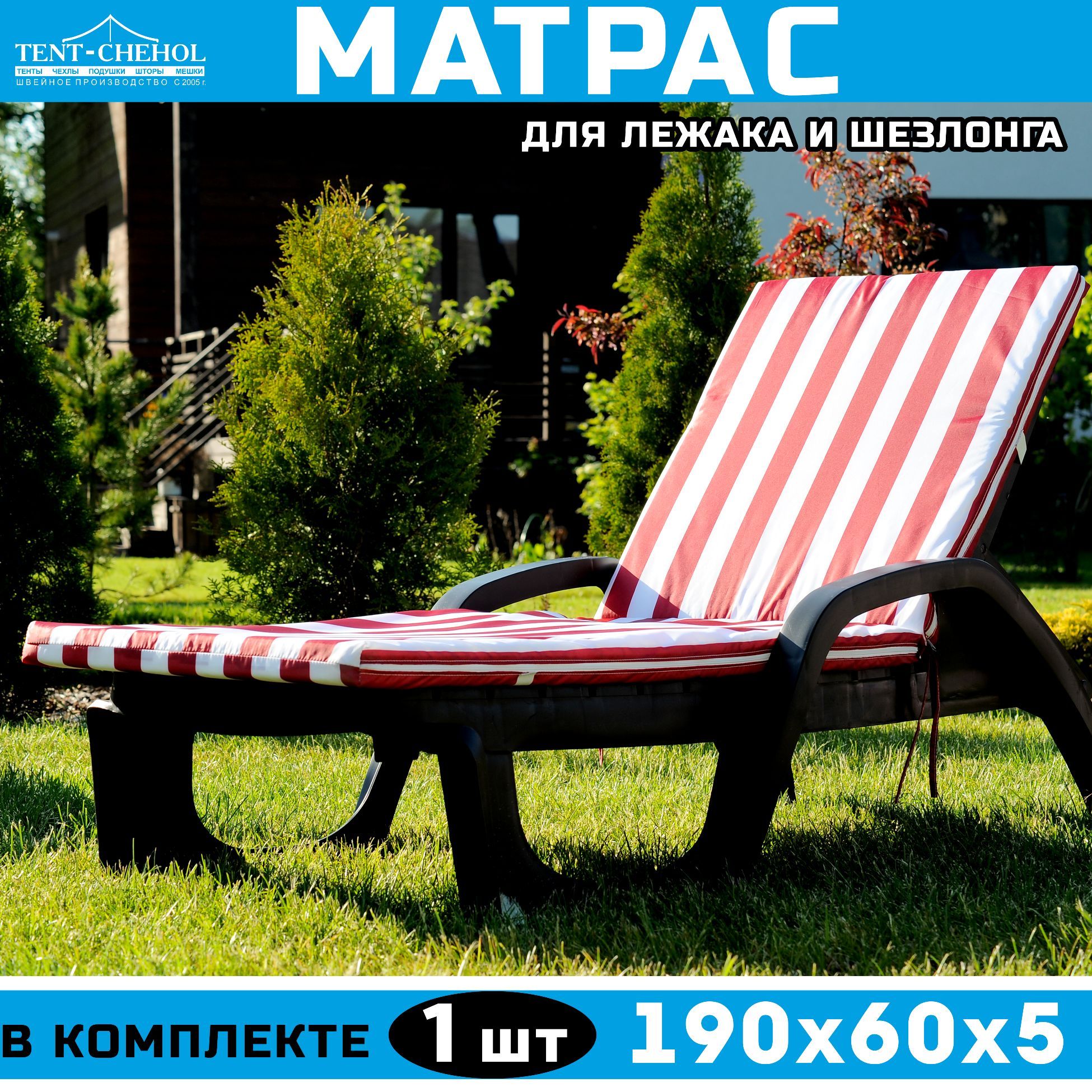 Матрас имеет длину 190 см, ширину 60 см и высоту 5 см - они идеально подходят к большинству шезлонгов.