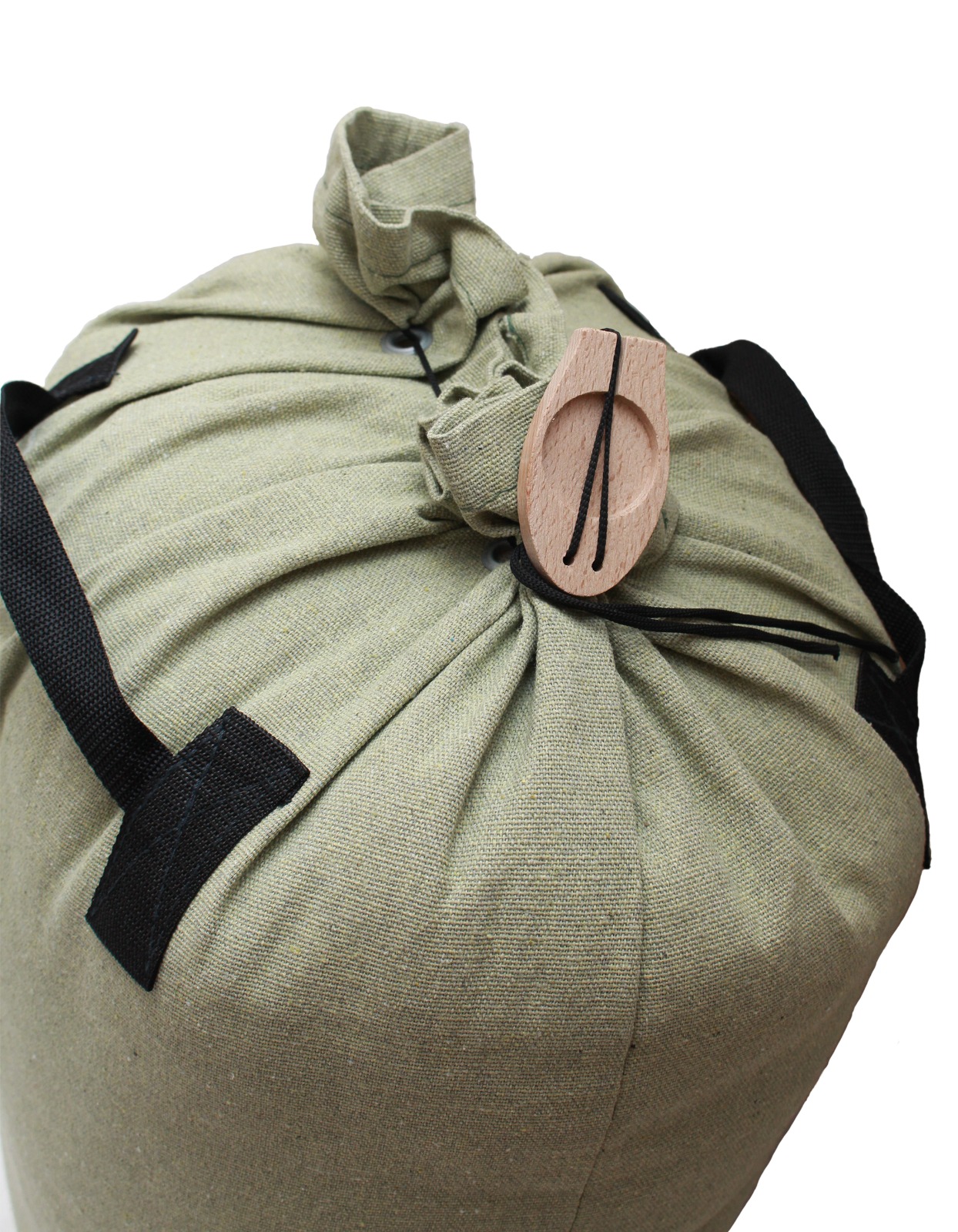 Изделие оснащено специальными ручками, металлическими люверсами и шнуром для плотного затягивания торбы. Внутренние швы обработаны, по периметру усилены лентой дополнительного материала.