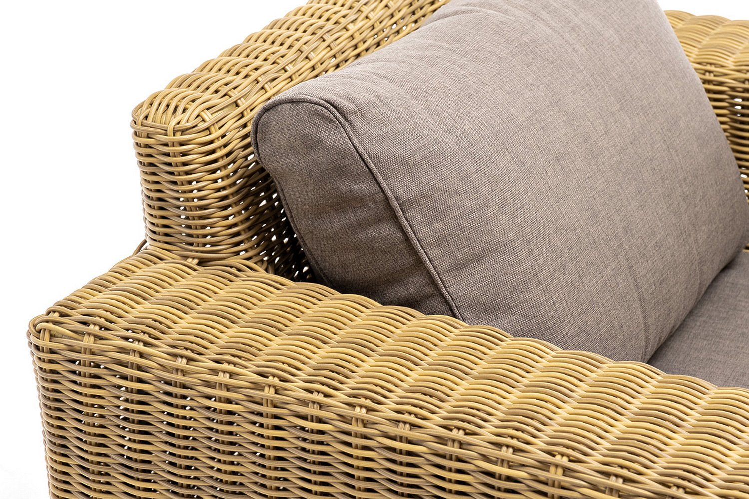 Кресло Боно имеет широкие подлокотники, просторное сиденье и невысокую спинку. Оно изготовлено из алюминия и искусственного ротанга, габаритные размеры в собранном виде - 100х77,5х90 см. Цвет кресла – бежевый (соломенный), что позволяет ему отлично смотреться в любом интерьере.
