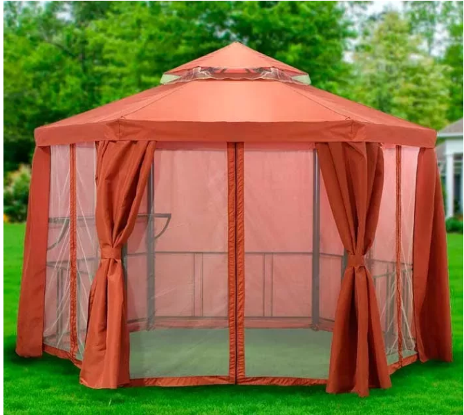 Шторы в комплекте создадут уют и комфорт внутри павильона, обеспечивая приватность и защиту от солнца. Антимоскитная сетка предотвращает проникновение насекомых внутрь павильона, что обеспечивает комфортное времяпрепровождение. Тент, в свою очередь, обеспечивает защиту от непогоды и ультрафиолетовых лучей.