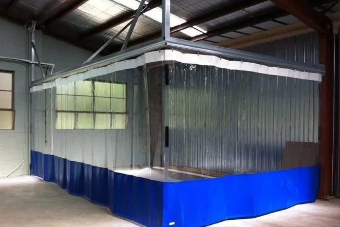 Полотно монтируют не только в рабочей зоне, но и при въезде в помещение. Такое решение сокращает теплопотери в холодное время года, а так же предотвращает от попадания пыли или грязи.
